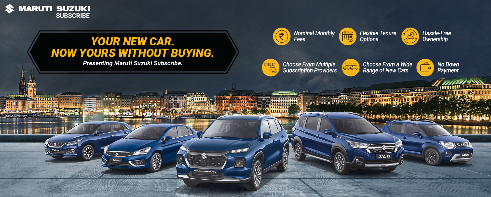 Maruti Suzuki Subscribe enables all customers to enjoy driving their preferred Maruti Suzuki cars without having to deal with all the financial responsibilities that come with owning a car.All you need to do is opt for a monthly subscription plan at a fixed monthly fee, which includes the routine maintenance and insurance costs, and choose a flexible tenure. At Vipul Motors in, , Bikaner , all Hatchback, Sedan, SUV, the MUV models line-up includes Baleno, Invicto, EVitara, Jimny, Ciaz, Ignis, Fronx, Grand Vitara, XL6. Here, you will enjoy Maruti Suzuki Subscribe benefits such as: